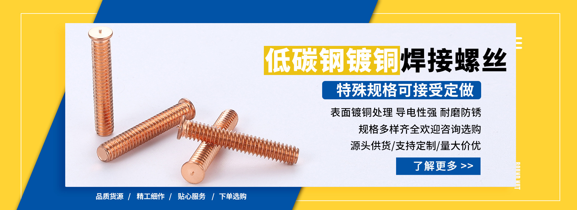 深圳市裕豐五金制品有限公司在多年的經營中不斷積累技術力量,把握機遇,充分發揮自身優勢形成了產、供、銷一條龍的生產體系,以精益求精、質在卓越的宗旨逐步成為同行業佼佼者,至今我們有三千一百四十二種規格的螺柱焊釘生產經驗,是中國最早開發、生產焊釘(又稱種焊螺柱、電栓焊接螺栓或植焊釘)的專業廠家,是焊釘生產領域亞洲地區最具權威和實力的企業之一,同時也是目前中國國內唯一一家專業從事焊釘生產、研究、開發的企業。 現在,我們擁有34262.2平方米的生產基地,200多名優秀員工。真誠期待海內外客商的合作,我們將為您提供最好的產品,最好的服務。