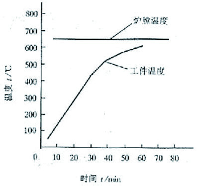 由于該工件厚度較厚,體積較大,采用硬加熱規范,把爐膛溫度預置到650℃,然后把安置好釬料和釬劑的工件放入爐膛進行加熱,待工件溫度上升到600℃即可出爐冷卻。圖3為爐膛和工件溫度與時間的變化曲線。2.3 焊后清洗 釬焊后的工件在20%左右的硝酸溶液中清洗,可以得到滿意的清洗效果。